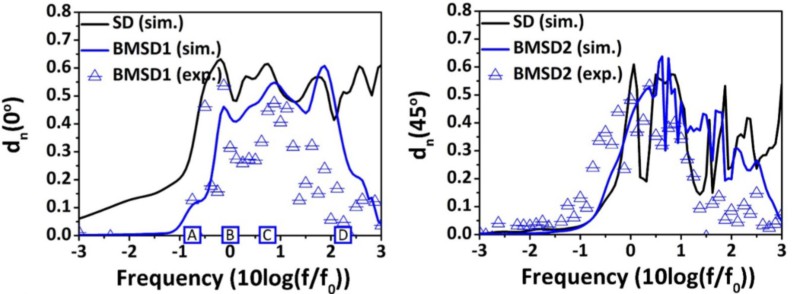 图4 优化带宽后的超薄施罗德扩散体 (BMSD) (蓝色)和传统施罗德扩散体 (SD) (黑色) 的归一化扩散因子对比。左图和右图分别为正入射和45度入射情形。