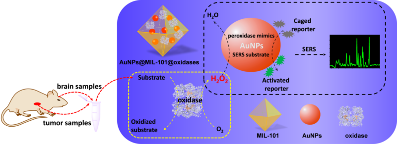 进一步,该课题组研究人员及其合作者利用金纳米颗粒(AuNPs)类过氧化酶的催化活性和拉曼增强作用的双重功能,构建了基于AuNPs纳米酶激活的SERS检测方法。合成的金属有机骨架(MIL-101)保护的AuNPs(AuNPs@MIL-101),不仅能保持AuNPs类过氧化物酶和拉曼增强的双重功能,而且能提高AuNPs的稳定性。首先,基于AuNPs@MIL-101的类过氧化物酶活性,在H2O2存在下,催化还原型非活性拉曼分子(隐性孔雀石绿LMG)氧化生成拉曼报告分子(孔雀石绿MG);然后,基于AuNPs@MIL-101的拉曼增强功能,进一步增强催化产物MG的拉曼信号。通过在AuNPs@MIL-101表面组装其他氧化酶如葡萄糖氧化酶、乳酸氧化酶(AuNPs@MIL-101@oxidases)构成集成纳米酶,能发生有效的酶促级联反应,实现相应生物分子的检测。集成纳米酶AuNPs@MIL-101@oxidases能成功用于老鼠体内疾病(缺血中风、肿瘤)相关的重要生物分子(葡萄糖、乳酸)的检测,以及药物治疗中药效的有效评估。该研究不仅建立了活体分析的SERS检测方法,也将对纳米酶(nanozymes)的研究有很好的启发。该工作发表在《ACS纳米》杂志上(ACS Nano, 2017, DOI: 10.1021/acsnano.7b00905)。