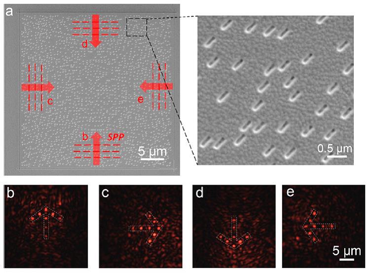 图二:(a)按照四个方向传播的SPP作为参考光进行空间成像的复用全息设计和样品照片。(b-e)实验测得由不同方向传播SPP所重构出的空间全息图。