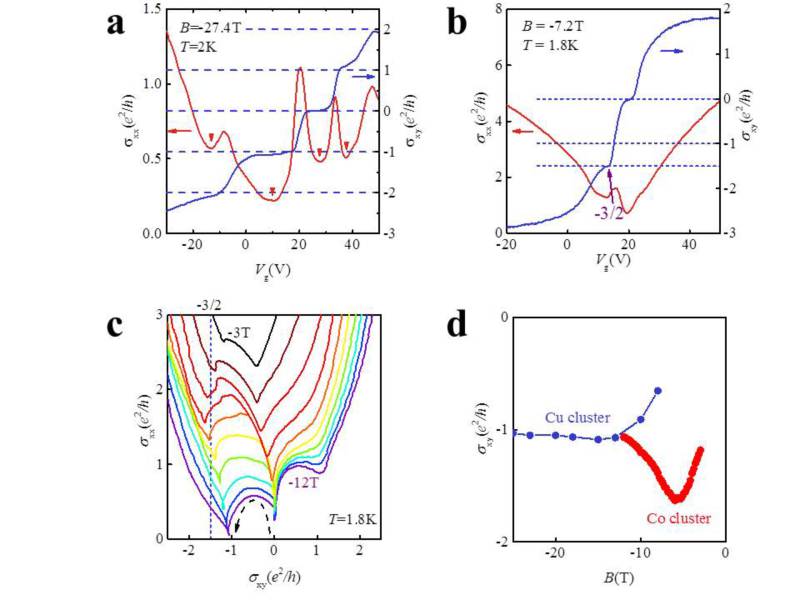 图1(a)2K和27.4T下的5个量子霍尔平台;(b)7.2T下的3/2量子霍尔平台;(c)钴团簇修饰后的重整化群流分析;(d)钴团簇修饰后的反常量子化轨迹与铜团簇修饰后的轨迹。