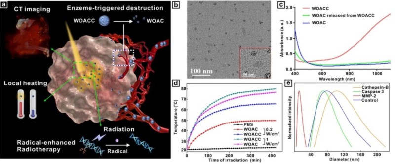 图1.“集束炸弹型”氧化钨纳米聚集体提高肿瘤放疗效果示意图