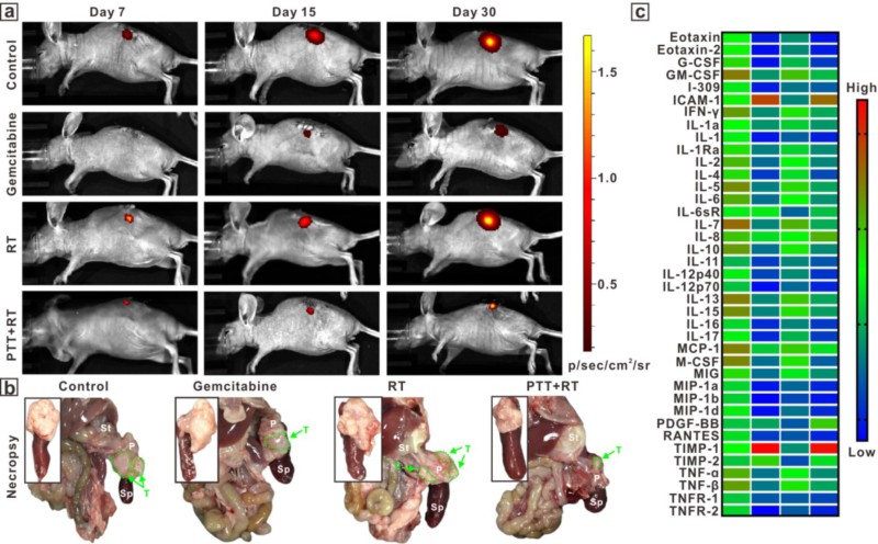 体内研究发现,高转移性的乳腺癌肿瘤模型经放疗后,肿瘤生长受到明显抑制,荷瘤小鼠生存期明显延长(图2b,c),同时肿瘤细胞向肺部和肝部转移也得到很好控制。此外,该纳米聚集体对放疗不敏感的胰腺癌也具有良好的放疗增敏作用(图3)。经光热治疗/放疗联合治疗,胰腺肿瘤体积明显缩小,且相关的生化因子显示,联合治疗后,血液中的炎症因子和相关肿瘤指标数值明显降低,展示出良好的抗肿瘤效果。相关成果“Hypoxia-Targeting, Tumor Microenvironment Responsive Nano-Cluster Bomb for Radical-Enhanced Radiotherapy”已在线发表在ACS Nano(DOI:10.1021/acsnano.7b04737)。霍达博士为论文第一作者,周正扬教授和胡勇教授为该论文的共同通信作者。