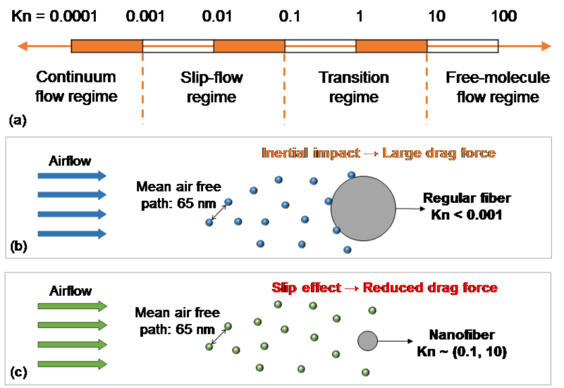 纳米纤维薄膜一般基于不同原材料,通过静电纺丝技术制成。由于纳米纤维直径较小,和空气分子平均自由程接近,所对应的努森数(Knudsen number)较大,纤维表面空气流速不再是0,在空气滑移效应的作用下拖曳力减小,从而使得纳米纤维薄膜有着相对较小的空气阻力。因此,纳米纤维薄膜纱窗可能可以在具有PM2.5高效去除效果的同时保证建筑通风换气量在可接受的水平。