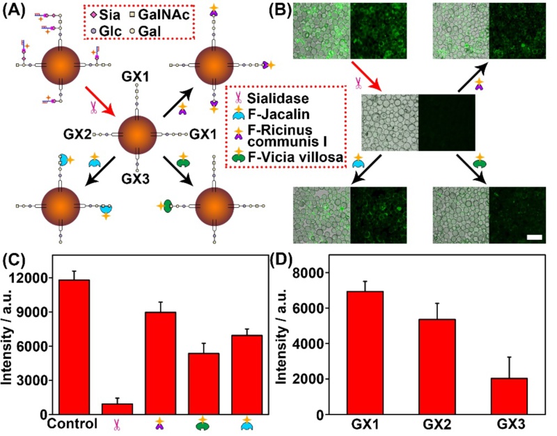 该研究工作由助理研究员陈云龙为第一作者,鞠熀先教授为通讯作者于10月25日投稿,11月13日预录用。他们构建的一对功能化浮力微球包括提取探针和收集探针(图1)。提取探针以马来酰亚胺修饰的二氧化硅浮力微球为基底,在其上共价结合具有核酸内切酶切割位点和硼酸末端的DNA分子,通过硼酸与细胞表面唾液酸的共价识别作用,将细胞表面包含唾液酸的生物分子通过浮力提取。在核酸内切酶的作用下,被提取的生物分子被释放到溶液中,并由十八烷硅烷化的收集探针通过疏水作用收集其中的结合有核酸碎片的神经节苷脂,进一步利用体外杂交链反应对神经节苷脂进行荧光定量。用唾液酸剪切酶切除收集探针上收集的神经节苷脂中的唾液酸残基,通过荧光标记的凝集素识别残留聚糖,该工作发展了细胞表面神经节苷脂亚型的筛选鉴定方法,并第一次提出三种神经节苷脂亚型(图2)。利用提取探针对细胞表面唾液酸包含物进行不同程度地提取,可用这两种探针对细胞表面神经节苷脂的再生过程进行监测。与已有的神经节苷脂分析方法相比,该方法无需细胞破碎及其它预处理,首次实现了细胞表面神经节苷脂的定量筛查、亚类鉴定和再生分析,为揭示神经节苷脂相关的生命过程提供了重要工具。