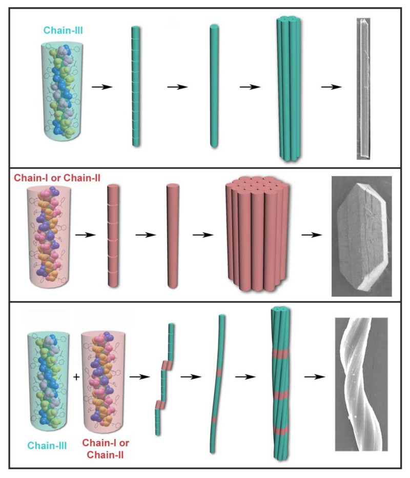 郑丽敏教课题组利用手性1-苯乙基胺基甲基膦酸(pempH2)作为配体,在不同pH条件下分别与硝酸铽组装得到块状(R-2, S-2)和棒状(R-3, S-3)形貌的单一手性稀土金属有机膦酸化合物晶态材料,它们具有不同的链状结构。当pH处于两者之间(约3.1)时,得到与化合物3具有相同组成和结构的宏观螺旋材料[Tb(R-,S-pempH)3]?2H2O (R-1, S-1)。为了从理论上对不同自组装行为进行解释和预测,该课题组与物理学院马余强课题组合作,利用全原子模拟和布朗动力学模拟分别从微观和介观层次分析了pH和NO - 3对组装结构的影响。最后,结合实验和理论模拟给出了螺旋形成的内在机理:宏观螺旋结构的形成通过多级自组装的方式,组装过程涉及到溶液中共存的不同类型的链结构,由于这些链结构在几何上不匹配,导致链的堆积生长发生扭曲,进而形成宏观螺旋结构。这种通过pH调控使配位聚合物的分子手性得以传递和放大,并最终得到手性宏观螺旋体的方法尚未见国内外报道。