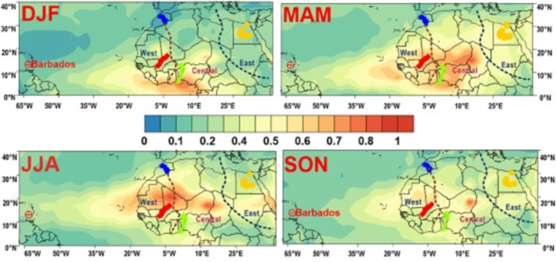 图1. 季节变化的光学气溶胶厚度(AOD)与北非尘源同位素分区