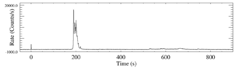 图3. GRB 160625B γ射线波段的光变曲线,完美诠释了伽玛暴γ波段辐射的完整组成:前兆辐射(precursor)、瞬时辐射(main prompt emission,亦称主暴)和延展辐射(extended emission)。图片来源 Zhang, B.-B. et al 2018, Nature Astronomy,2, 69