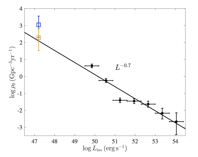 图2. 由GRB 170817A 及 GW170817计算得到的低光度伽玛暴发生率(黄色)和致密星并合的发生率。
