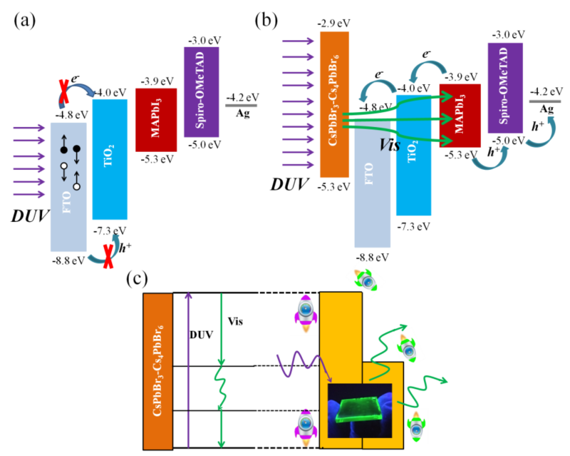 进一步,针对无机钙钛矿在紫外-可见光区域的强吸收性能和光致发光性能,通过在有机钙钛矿探测器的FTO基底外部蒸镀一层无机钙钛矿材料作为窗口层,可将高能量的紫外光吸收、并直接转换成有机钙钛矿吸收最佳的(400~600 nm)可见光波段,从而实现对深紫外光探测。如此,不仅可以实现无机钙钛矿层的精确调控,又能有效的避免后续无机钙钛矿中的溶剂对有机钙钛矿层的破坏,大大提高了探测器的稳定性。相关工作发表在《物理化学快报》上(Journal of Physical Chemistry Letters, DOI:10.1021/acs.jpclett.8b00429),该工作亦受邀以ACS LiveSlides形式Highlight。