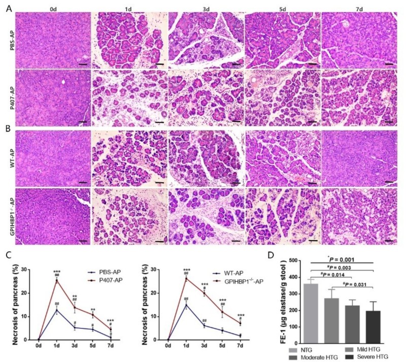 为明确HTG对急性胰腺炎修复的作用,该团队对重症胰腺炎中心73名患者长达1年的随访,使用粪弹力蛋白酶评估了患者出院1年后的胰腺外分泌功能恢复的情况。结果发现患者甘油三酯水平与粪弹力蛋白酶水平呈负相关。进而,该团队利用两种HTG动物模型:泊洛沙姆(poloxamer 407, P407)诱导的HTG小鼠和糖基磷脂酰肌醇高密度脂蛋白结合蛋白1(glycosylphosphatidylinositol anchored high density lipoprotein binding protein 1,GPIHBP1)基因缺陷小鼠,腹腔注射雨蛙素建立AP动物模型。结果显示,相比于正常甘油三酯小鼠,HTG小鼠胰腺修复显著延迟,且血清甘油三酯水平越高修复越慢。考虑与AP修复相关的纤维炎性反应以及腺泡细胞增生等有关。