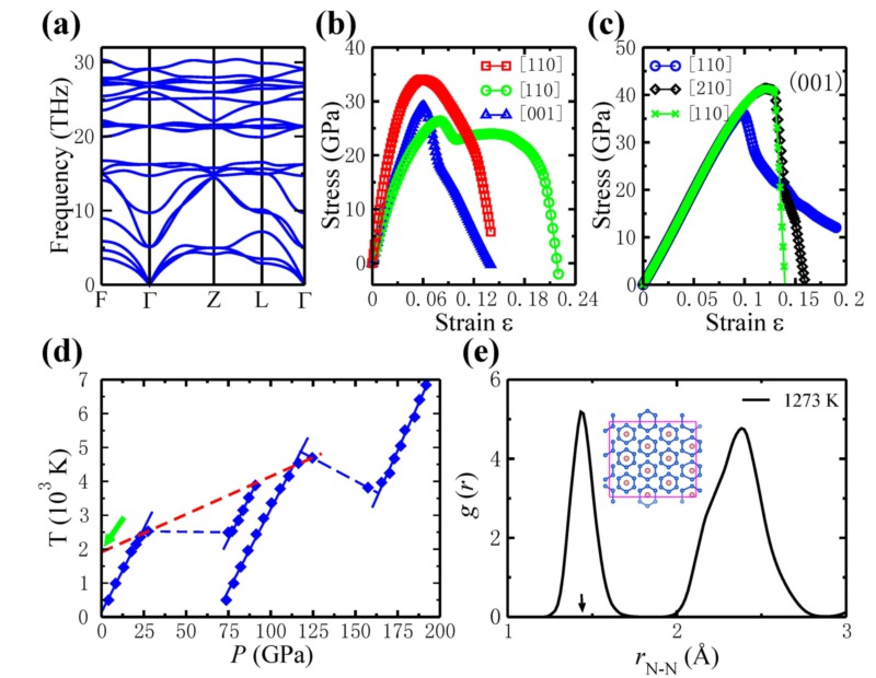 图3. h-WN6动力学和热力学稳定性计算((a):声子谱;(b):理想拉伸下应力应变关系图;(c):维氏剪切形变下应力应变关系;(d): Z方法估算熔点;(e): 1273K 高温下第一性原理分子动力学模拟的N-N原子对分布统计结果)