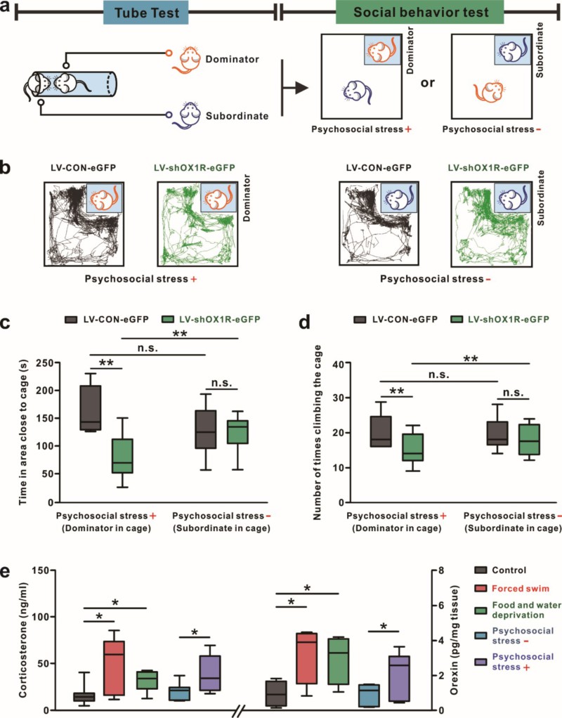 图2. 腹侧苍白球中的内源性orexin能神经传入减弱心理社会应激导致的社交回避行为。