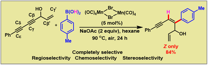 芳基硼酸具有特异的反应活性、稳定性、易得性、易操作性,是一类非常重要并有着广泛合成应用的芳基源。由于非螯合的多羰基芳基Mn化合物活性非常高,容易发生分子内的配体迁移重排反应;而高价Mn催化剂容易与芳基硼酸发生单电子氧化形成相应的芳基自由基。因此,Mn催化的芳基硼酸在有机合成中的应用仍然是Mn催化领域的一大挑战。化学化工学院分子与材料合成研究团队提出了通过桥连双核Mn催化产生更高活性的空配位的芳基锰物种,直接与1,3-共轭双炔快速配位,完成区域、立体和化学选择性氢芳化反应。该方法为(Z)-构型共轭烯炔的模块化合成提供了一种通用策略,且具有操作简单、官能团相容性好等特点,对各种重要的官能团都具有很好的耐受性。同时,低价锰参与的转金属作用得以证实,课题组成功得到反应中间体的单晶结构验证。通过理论计算,一种基于“O-H…p interaction”的新型定位策略被首次应用炔烃的氢芳化转化。
