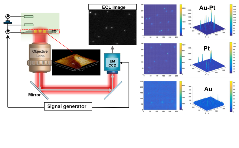 目前,人们对生命现象的观察和研究已经深入到单细胞、单颗粒和单分子的微-纳尺度的水平,如何在这样一个尺度范围内获取精准的生物化学信息,是分析化学各个研究领域面临的严峻挑战。凯发k8官网化学化工学院陈洪渊院士/徐静娟教授课题组围绕他们应时提出的所谓 “三单一成像”,即:单细胞、单颗粒、单分子分析和高时、空分辨的成像,做出了一系列开创性工作。2018年2月,课题组利用超灵敏电化学发光成像,实现了在纳米尺度上多种贵金属结构的高通量表面电化学行为的成像,消除了大尺度带来群体行为的平均化问题,从而能应用于识别单个颗粒之间行为特性的差别。相关工作发表于Angewandte Chemie International Edition (2018, 57, 4010 –4014)。该论文的第一作者为化学化工学院博士生朱孟娇,通讯作者为赵微副研究员和徐静娟教授。