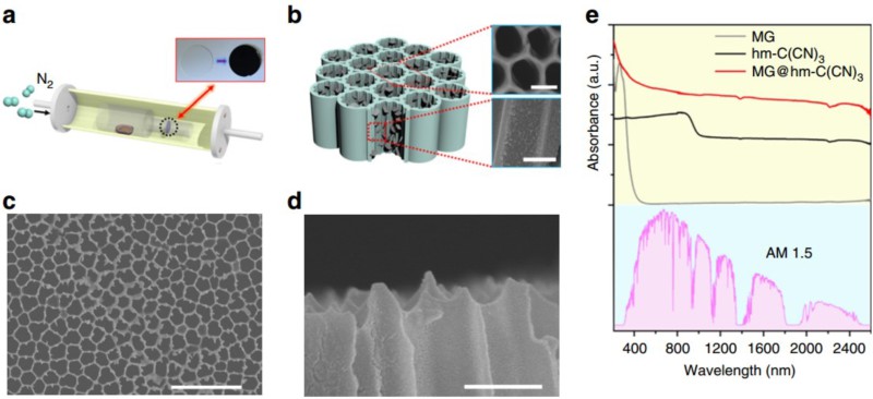 研究团队首先通过DFT理论计算和实验发现了层状氮化碳材料[C(CN)3]具有半金属性,接着利用多孔AAO结构作为材料生长模板,使得小尺寸的氮化碳纳米薄片附着在人工纳米多孔管阵列中增多暴露的活性位点,同时构建了一种特殊的光学微腔共振光栅结构增强对太阳光的吸收。此外,这种设计还有利于催化剂的便捷回收。