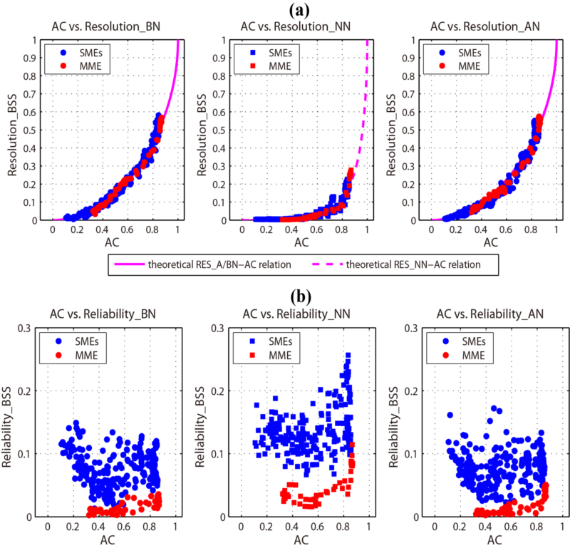 图2全球夏季200hPa位势高度纬圈合计的(a)分辨力及(b)可靠性对确定性预报技巧(AC)散点图。其中,蓝色代表五个单模式,红色代表多模式集合。左边一列展示的概率技巧是“Below-normal”种类事件的技巧,中间一列是“Near-normal”的技巧,右边一列是“Above-normal”的技巧。(a)中品红色曲线代表分辨力与确定性技巧之间的理论函数关系。