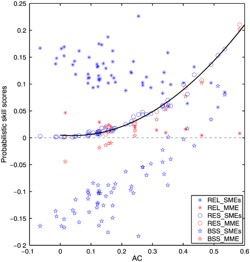 图1 西北太平洋-东亚夏季风(850hPa纬向风及降水)区域合计的可靠性(REL; 星号)、分辨力(RES; 空心圆圈)、总概率预报技巧(BSS; 空心五角星)对确定性预报技巧(AC)散点图。其中,蓝色代表五个单模式,红色代表多模式集合。黑色曲线代表分辨力与确定性技巧之间的二次多项式拟合关系。图中展示的概率技巧是“Above-normal”和“Below-normal”两个种类事件的平均技巧。
