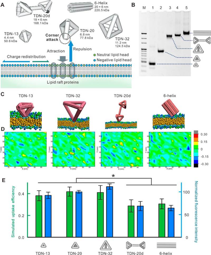 此外,结合模拟和实验,我课题组进一步证实了角攻击和区域选择性在DNA纳米结构与细胞相互作用过程中的普适性,即无论DNA纳米结构的尺寸和形状如何改变,这两种方式都普遍存在(图3A-D)。不过由于形状的改变,DNA纳米结构的角攻击能力有可能发生变化,从而在一定程度上会影响其细胞摄取效率(图3E)。