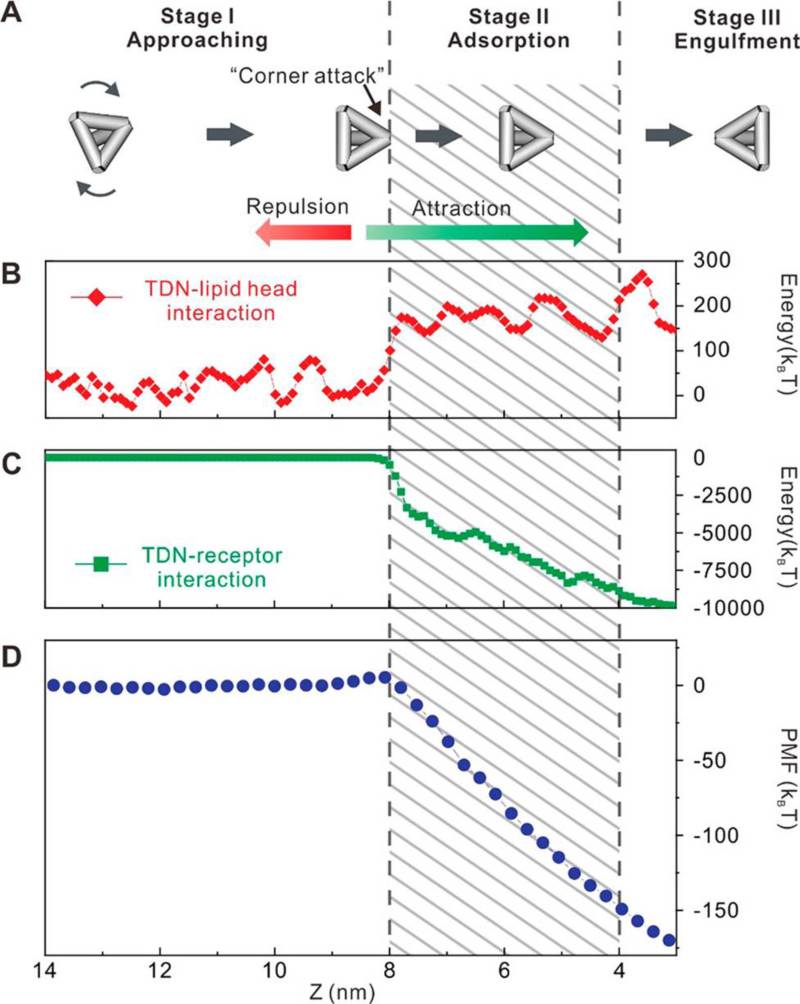 在这项工作中,课题组首先合成了棱长为20 bp的正四面体DNA纳米结构(TDN-20,带负电)。细胞实验表明,TDN-20可以通过小窝蛋白介导的内吞作用(caveolin-mediated endocytosis)高效地进入癌细胞中(图1A-C)。接着通过计算机模拟,发现TDN-20往往采用角攻击(corner attack)的方式接触细胞膜(图1D-F),同时在进入细胞过程中倾向于选择负电性较低的区域(图1G)。值得一提的是,与带负电的球形纳米粒子(无法进行角攻击)相比,TDN-20的摄取效率是它的2倍以上。进一步地,通过计算体系能量,课题组发现这两种方式的确能够有效地降低TDN-20与负电细胞膜间的静电排斥作用,从而极大地提高其进入细胞的效率(图 2)。