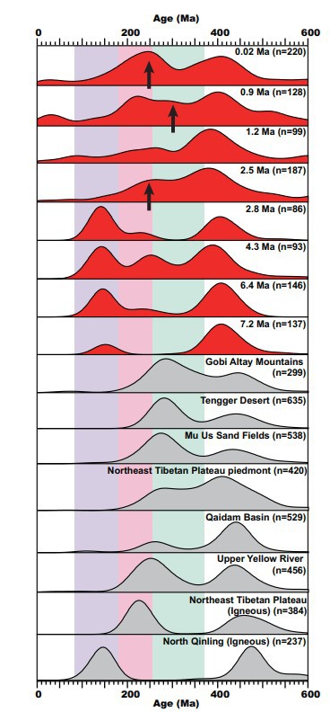 不同时间段黄土高原南部蓝田地区碎屑锆石U-Pb年龄谱特征及其与潜在物源区的U-Pb年龄谱特征对比。(箭头指示不同沉积时间锆石年龄谱变化)。