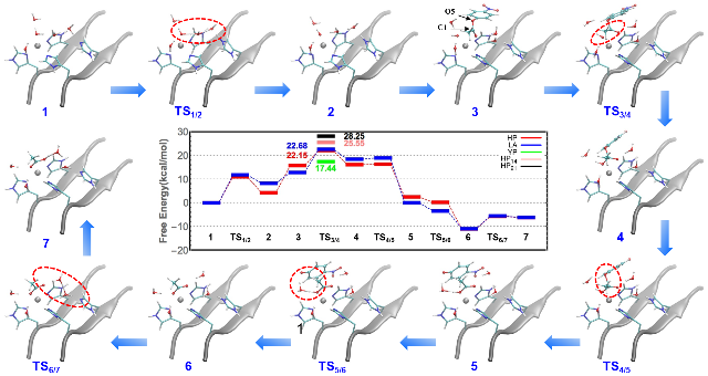 研究发现,两亲的多肽链在溶剂中通过氢键和范德华力及疏水作用,自发形成类似磷脂双分子层的有序结构。改变多肽链的氨基酸序列可以显著改变聚集体的形貌。相邻的多肽链形成的β片结构会呈现平行或反平行的不同排列,整体的纤维结构也会呈现不同程度的扭曲。通过比较体系氢键数量、扭转角度、溶液可接触面积等特征参数发现,相比于“平整”结构,“扭曲”结构能够更好的兼顾“刚性”与“柔性”。这种动态平衡既充分保证自组装结构的稳定性,同时又使得催化所需的金属离子结合在自组装结构表面形成的反应活性中心时能够形成最优的配位结构,从而高效的实现催化功能。高精度量子力学计算得到的反应路径表明,“扭曲”结构经历的反应能垒低于“平整”结构的值,说明结构的微观差异是影响催化反应的重要因素。通过对四百余个碳酸酐酶晶体结构的分析发现,天然酶的活性中心具有类似的“扭曲”结构,进一步说明对于天然酶活性中心微环境的模仿是提高仿酶活性的关键参数。因此,该研究从原子层面理解了多肽自组装体的结构与机制,将特殊的微观结构与宏观性质联系起来,为设计具有更高催化活性及更广泛催化能力的功能性生物材料提供了理论指导和依据。理论计算提出的结构模型得到了固体核磁等多种实验表征手段的验证,充分说明多尺度模拟手段研究复杂体系具有较好的准确性和预测性。此外,该工作对脑科学相关的脑疾病机理研究具有基础性作用。