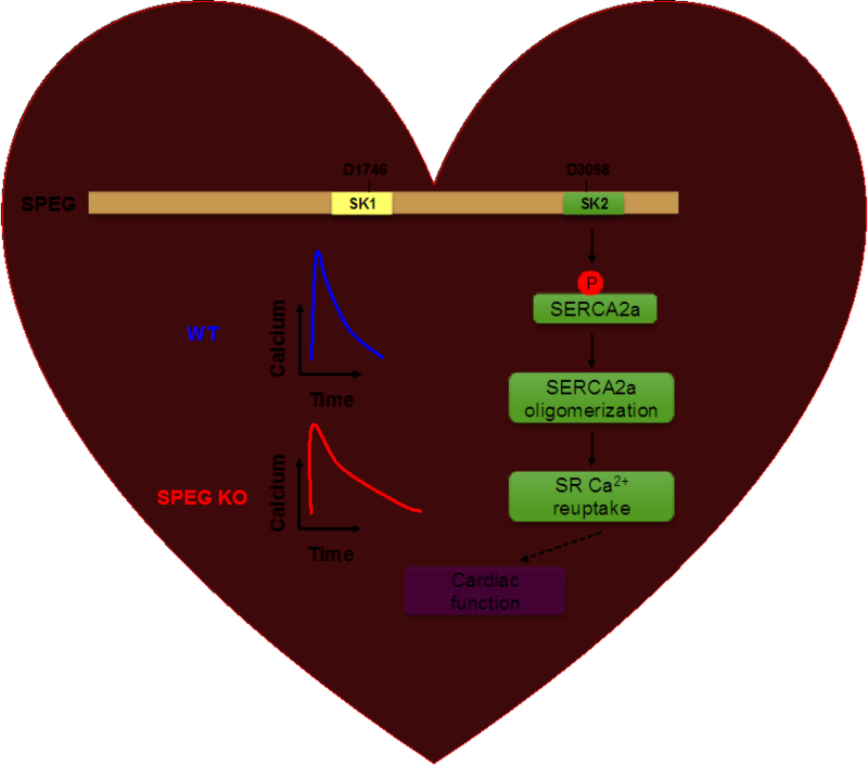 SPEG属于肌球蛋白轻链激酶(MLCK)亚组钙调蛋白激酶(CaMK)丝氨酸/苏氨酸蛋白激酶家族的一员。其C端含有两个串联的丝氨酸/苏氨酸蛋白激酶结构域,其第一个激酶结构域与MLCK亚组的其他成员具有更高的同源性。之前有研究表明,SPEG不仅是心脏发育所必需的、也是维持成年小鼠心脏功能所必不可少的;但是到目前为止仍然不清楚SPEG是如何来调控心脏功能的。