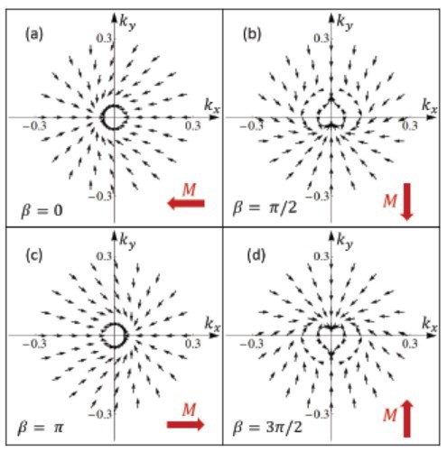 图1:二维拓扑激子相的自发磁化特征。(a),(b),(d),(d)展示磁化方向随着激子序参量的全局位相的变化发生演变。