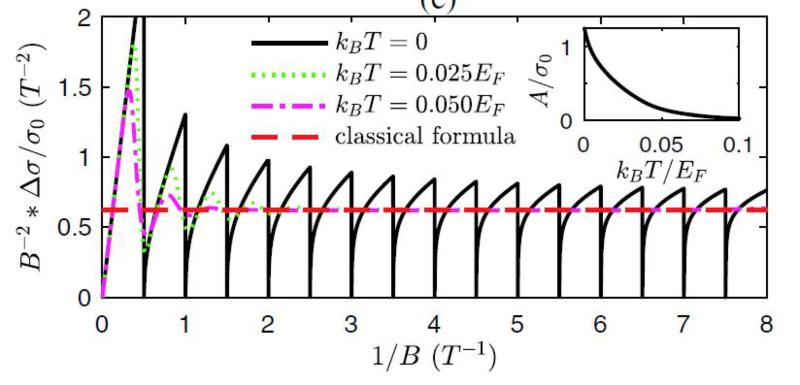 目前实验鉴定外尔半金属的一个方法是使用角分辨光电子能谱(ARPES),但这一方法常受到分辨率的限制。另外一个常用的实验方法是纵向磁电阻的测量,纵向负磁电阻(正磁电导)效应被认为是外尔半金属手性反常导致的一个特有的电子输运特性。但是凝聚态物质中的负磁电阻可以有许多起因,手性反常不是唯一起因。也就是说,纵向负磁电阻的观察只是外尔半金属的必要条件,但不是充分条件,因而不能依此鉴定外尔半金属。为了解决这一重要问题,盛利和邢定钰课题组把手性反常、朗道能级量子化和玻尔兹曼方程相结合,推导获得了一个外尔半金属磁电导率的新公式。他们的计算发现:外尔半金属不仅有正磁电导效应,而且其正磁电导随磁场变化会发生周期为1/B的量子振荡,如下图所示(B是磁场强度,右上角小图表示振荡幅度A随温度的衰减)。在此基础上,他们提出纵向负磁电阻加上其量子振荡可以作为鉴定外尔半金属的指纹性特征。这一量子振荡行为发生在纵向磁电阻中,和传统SdH振荡完全不同,后者发生在横向磁阻中。他们提出的外尔半金属的指纹特征在现有的一些实验文章中已经观测到。在其它一些实验中,无序或者有限温度可能会压制了这种量子振荡行为。但是,在足够低温度和足够强磁场下,对于较纯净的外尔半金属样品,这一振荡行为总是应该可以观测的。