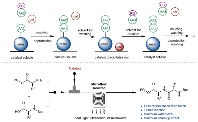 图2. 催化固相多肽合成和连续流动催化酰胺化反应