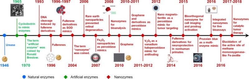 图1. 纳米酶的发展历程(作为参考,同时标注了天然酶及其它模拟酶的发展历程)。