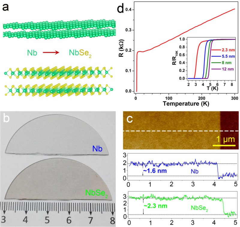 图1:(a)从Nb到NbSe2的结构变化示意图;(b)物理气相沉积法制备的2寸Nb薄膜和化学气相沉积法生长的NbSe2薄膜;(c)不同步骤下制备的Nb和NbSe2膜的厚度变化;(d)不同厚度的NbSe2变温电阻曲线,其超导特性随着厚度不同而变化。