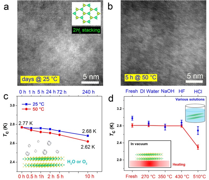 图2:(a,b)在大气气氛下常温放置数天,和大气下加热到50 °C后的扫描透射电子显微镜照片,其NbSe2薄膜晶格仍然保持完整;(c)超导转变温度(Tc)在大气气氛中,不同暴露时间的变化图(常温下,蓝线;50 °C时,红线);(d)浸泡在不同溶液(蓝线)和在真空退火条件处理后(红线),NbSe2薄膜的Tc的变化趋势图。