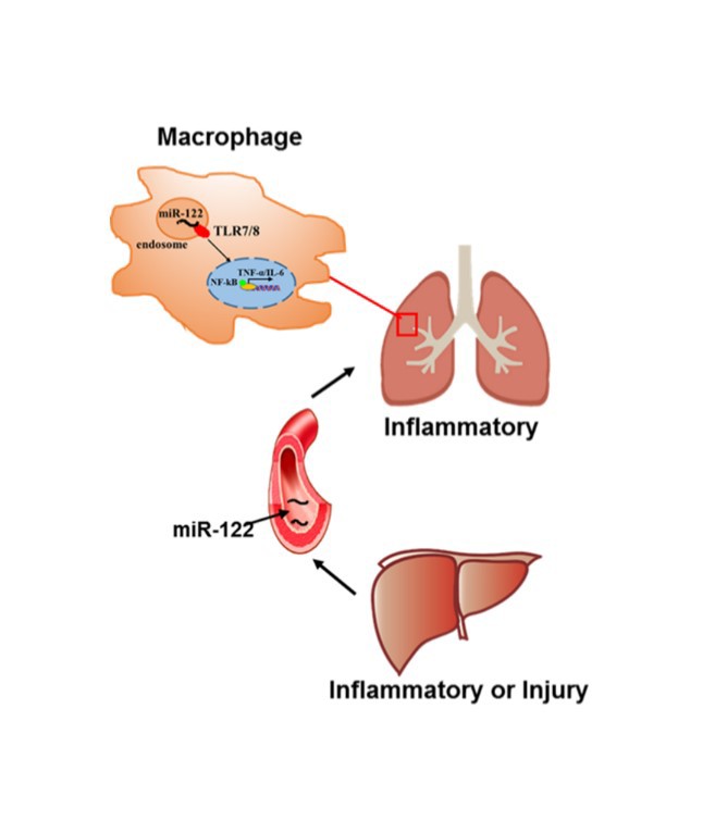 该团队研究了各种肝脏疾病(急/慢性肝炎、肝损伤、肝癌)引起肺部炎症的分子机制,发现肝脏疾病发生时,miR-122作为肝组织最特异、最丰富的miRNA,在血浆中上升最为显著,且循环系统中95%以上的miR-122是以非囊泡依赖性的形式存在。机制研究表明循环系统中的miR-122会进一步到达肺组织,通过与TLR7/8直接结合从而激活肺泡巨噬细胞,最终引起肺部炎症。该研究阐释了非囊泡依赖的游离miRNA的独特作用方式,表明游离的循环miRNA同样在机体内发挥不可忽视的病理生理作用。此外,该研究从全新角度提出肝脏疾病引起肺部炎症的发病机理,有望为临床治疗提供新思路。