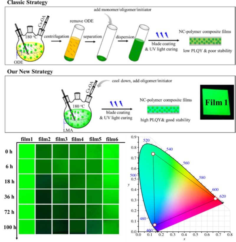最近,该团队采用采用可聚合的甲基丙烯酸月桂酯为溶剂以热注射法制备了铯铅溴纳米晶原液,直接与低聚物和引发剂混合,通过紫外光聚合原位制备了高质量的纳米晶-高分子复合薄膜。该工作发表于2019年3月出版的ACS Applied Materials & Interfaces上。与传统方法相比,甲基丙烯酸酯单体制备的钙钛矿纳米晶不需要繁琐的离心、分离和再分散,避免纯化过程对钙钛矿纳米晶的破坏。此外,与经典的十八烯体系纯化后制备的纳米晶-高分子复合薄膜相比,甲基丙烯酸月桂酯体系制备的薄膜具有更优异的光学性能,绝对荧光量子产率可高达85%~90%,在氙灯照射下表现出了优异的光稳定性,而传统方法制备的薄膜的绝对荧光量子产率仅为54%,在光照下其光学性能迅速下降。甲基丙烯酸月桂酯体系制备的复合薄膜具有良好的耐水性和耐热性(50 oC水中加热了200 h,仍然保持90%的发光效率)。采用高绝对荧光量子产率的绿光发射的复合薄膜和红色发射荧光粉(KSF)作为液晶背光中蓝光发光二极管(LED)的下转换荧光材料制备了原型显示器件,其在国际照明委员会(CIE)1931颜色空间中的色域覆盖率为115%,同时具有很高的光学稳定性。这些进展为铅卤钙钛矿纳米晶材料在广色域显示器件中的应用奠定了良好的基础。