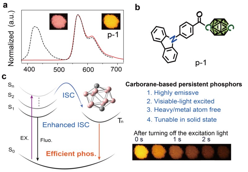 图1. a) 室温条件下的稳态荧光及磷光光谱; b) 硼簇发光分子结构; c) 高效磷光发光机理