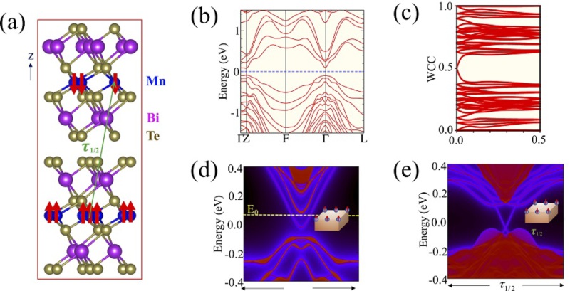 图表 1:(a),MnBi2Te4晶格结构原包,红色箭头表示Mn原子的磁矩。绿色箭头表示平移矢量。(b),反铁磁MnBi2Te4的能带结构,具有0.2eV的能隙。(c),Wilson loop计算。表明体系具有拓扑非平庸性质。(d,e)(001)表面上具有能隙的表面态(d),(011)表面(保持S对称性)上无能隙的拓扑表面态。