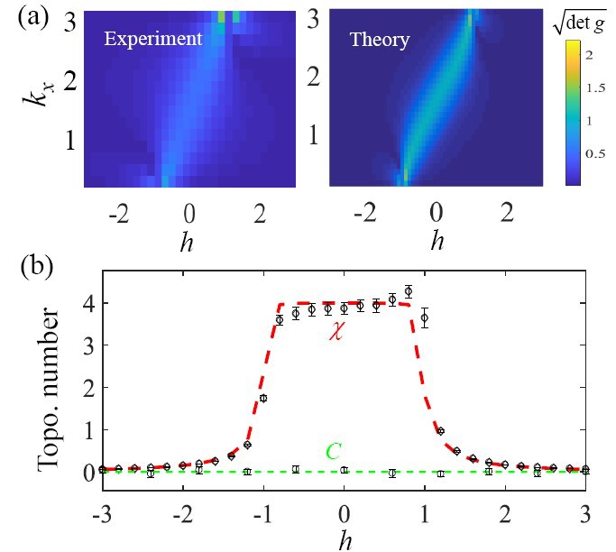 图4:(a)实验探测和理论计算出的度规。(b)拓扑量随参数h的变化。