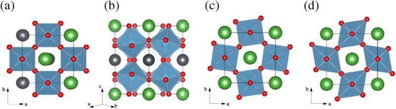 图1. PbTiO3/LaTiO3超晶格中主要的结构畸变。(a)沿面内a轴方向的极化畸变 P,(b)面内反向氧八面体旋转Φxy,(c)面外同向氧八面体旋转Θz,(d)Jahn-Teller晶格畸变Q。
