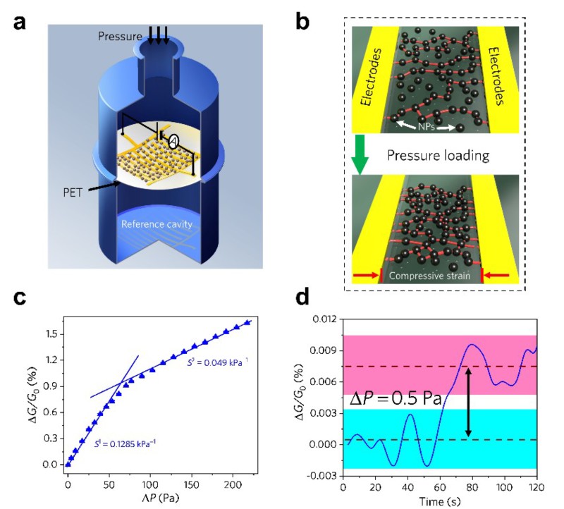 课题组采用掩模镀膜法,在0.05 mm厚的PET材料上印刷微型叉指电极。利用原子团簇束流沉积系统,在叉指电极之间可控制备金属团簇密集点阵。最后,将PET膜片密封于一个参考空腔上,从而完成压力传感器的制备。当压力传感器被置于不同的环境气压下,外界气压与参考空腔内部压力在PET膜片上形成一个新的力学平衡,PET膜片产生的应变将改变团簇点阵隧穿电导并被电学测量回路测得。该压力传感器的灵敏度达到0.13 kPa-1,在大气压环境中可以分辨小至0.5 Pa的气压变化(图1)(比目前通用硅基传感器分辨率提高了3个数量级以上,也远超其它材料所构成的压力传感器)。