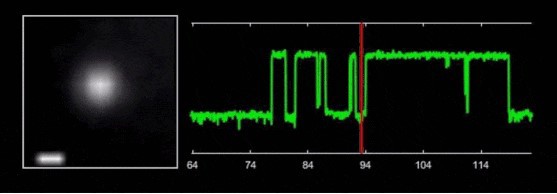 图1: 无电极纳米孔技术原理与应用。左上: 无电极纳米孔技术示意图。凝胶中的钙离子自由扩散穿过纳米孔与液滴中的钙离子荧光染料结合,产生荧光信号。右上: 基于无电极纳米孔技术的单分子传感。分子穿过纳米孔时会产生特异性的堵孔荧光信号,可用于环糊精、聚乙二醇和双链DNA的传感。左下: ClyA纳米孔和α-HL 纳米孔的同时成像与区分。由于孔径不同 (ClyA纳米孔: d = 3.6 nm, α-HL纳米孔: d =1.4 nm), ClyA纳米孔在荧光模式下能产生一个明亮的亮斑(红圈),而α-HL纳米孔则表现为一个微弱的亮斑(黄圈)。右下: ClyA纳米孔微液滴阵列。