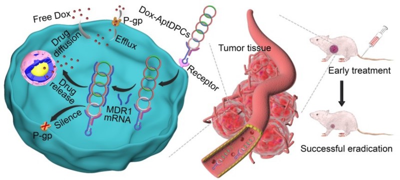 该工作自组装得到的AptDPCs具有较高的长径比,且其刚性结构能够抵抗核酸酶的降解,具有良好的生物稳定性。此外,该工作成功采用荧光基团、载药位点和反义寡链核苷酸(AS ODN)等对AptDPCs进行功能化,实现了MDR肿瘤细胞的生物成像、靶向药物递送及基因治疗。如图1所示,当负载阿霉素(Dox)的AptDPCs(Dox-AptDPCs)被MDR人白血病细胞(K562/D)特异性摄取后,Dox在胞质中逐渐释放,同时AS ODN与MDR1 mRNA杂交,抑制P-gp的表达,防止Dox泵出细胞,提高Dox在肿瘤细胞中的累积量,有效抑制肿瘤生长。体外和体内研究证实,在化疗和基因治疗的协同作用下,AptDPCs不仅可以实现靶向药物递送,显著降低系统毒副作用,而且可以有效增强MDR肿瘤的化疗效果,为MDR肿瘤靶向纳米治疗平台的开发开辟了新的途径。