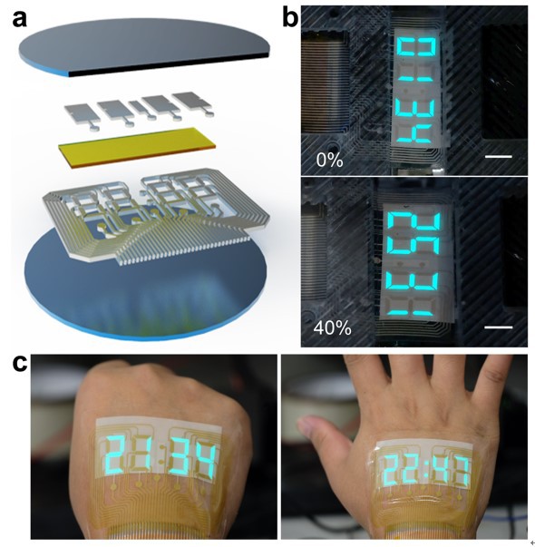 然而,当前基于交流电致发光的可拉伸器件发光层介电常数较低,需要较高的驱动电压才能达到足够的亮度。另外一方面,由于器件制备工艺的限制,当前可拉伸发光显示仅能实现简单的图案显示。针对以上问题,凯发k8官网现代工程与应用科学学院孔德圣课题组制备了一种高介电常数的可拉伸热塑性弹性体,并将其应用于可拉伸显示发光器件,实现了在低电压驱动条件下的高亮度发光。研究团队进一步研制出具有时钟功能的可拉伸显示器件,实现了贴肤穿戴条件下的信息显示,极大的推进了此类器件的实际应用。相关工作以《Stretchable high permittivity nanocomposites for epidermal alternating current electroluminescent displays》为题发表在美国化学会期刊ACS Materials Letters上(ACS Mater. Lett. 2019, 1, 5, 511-518)。