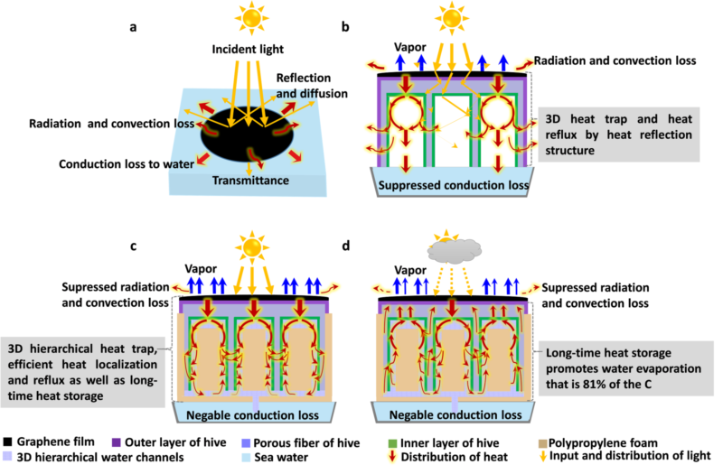 但是,当前的太阳能光-热(蒸汽)转化器大都依赖于持续稳定且垂直入射的光照条件或较高的环境温度以获得优异的光-热(蒸汽)转化效率。基于此,凯发k8官网徐骏教授团队继前期报道的具有全方位太阳光吸收的铜-硅纳米线分级结构太阳能集热器之后(J. Mater. Chem. A, 2018, 6,22976),与现代工程与应用科学学院的周林副教授合作,又报道了一种具有高效热捕获和储存能力的三维石墨烯/蜂巢(Graphene-based hive (GBH))太阳能光-热(蒸汽)发生器。该光-热(蒸汽)发生器具有分级的热捕获结构,可通过分级的热回流方式实现有效的热局域和热储存。其中,高温石墨烯层、与石墨烯接触的三明治结构蜂巢顶层及构筑于蜂巢内部的三明治结构水通道及热局域层,通过分级的界面局域加热实现高效的光-热(蒸汽)转化。最终实现了1个太阳光强度持续照射下~85%的光-热(蒸汽)转化效率。特别地,1小时内不连续光照下水蒸发的总质量达到连续光照下水蒸发总质量的81%。该GBH结构的设计,实现了高效的热捕获、热局域及长期的热储存效果,有利于高效集热系统的开发和在自然环境(晴天或阴天)中工作的高效太阳能光-热(蒸汽)产生系统的开发。