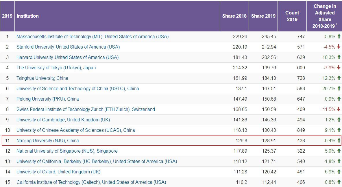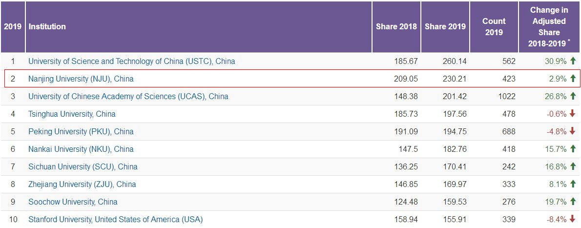 2020年4月30日发布的2020自然指数年度榜单(Nature Index 2020 annual tables)显示,凯发k8官网位居全球科研机构第13位、全球高校第9位、中国高校第4位,调整后的贡献份额增长幅度在全球前20高校中列第6位。