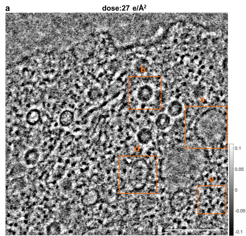 图3所示为腺病毒颗粒感染的细胞在低电子剂量条件27 e/?2的叠层成像相位图像,成像区域大小为1.14 × 1.14 μm。细胞内亚结构衬度清晰可见,如腺病毒颗粒(b)、空泡(c)、运输小泡(d)、游离ribosome蛋白颗粒(e)等,且这些亚结构的内部结构衬度清晰,如b中的腺病毒颗粒,壳层六边形结构明锐,结构核部遗传物质清晰可见。该结果表明叠层衍射成像可实现生物样品在低电子剂量条件下的微米级大区域成像。