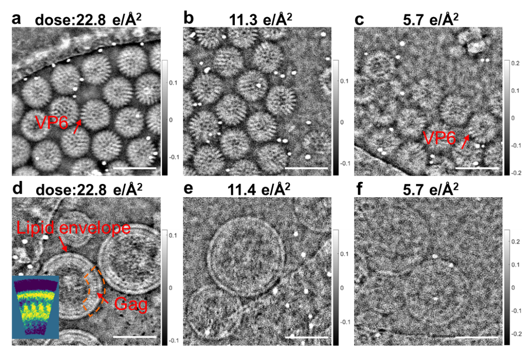 图2 不同低电子剂量条件下DLPs及HIV-1病毒颗粒的原位冷冻叠层成像相位像 (a-c)DLPs; (d-f) HIV-1;d内小插图为弧形区域的平均结果;图中标尺为100 nm
