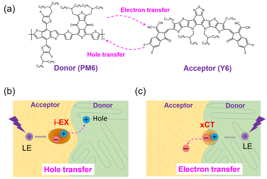 图1.非富勒烯受体有机光伏体系电荷拆分通道。(a)非富勒烯有机光伏体系中,从小分子受体(Y6)到聚合物电子给体(PM6)的空穴转移过程跟给体(PM6)到受体(Y6)的电子转移过程同等重要;(b)新发现的空穴转移经过畴内分子间激发态(i-EX)实现电荷拆分;(c)传统电子转移过程经过界面电荷分离态实现电荷拆分。(Wang et al., J. Am. Chem. Soc. DOI: 10.1021/jacs.0c04890 (2020)). 畴内分子间激发态主导的电荷拆分新机制的发现明确了分子聚集态在光电转换过程中的重要作用,调控畴内和界面间激发态的能级排列和相互作用有望成为优化有机光伏器件性能的新策略。
