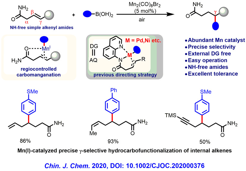 未活化内烯的区域可控选择性官能团化是过渡金属催化领域中的前沿研究难点。常规策略是引入喹啉胺类导向基来实现较好的区域选择性,但是需要导向基的引入与移除,从而降低了反应的官能团兼容性。强极性、弱配位的伯酰胺是常见的一类官能团,但是对大多数金属催化体系的兼容性较差。谢劲课题组基于前期工作以,近日实现了锰催化非活化内烯的高选择性氢芳化和氢烯基化(Chin. J. Chem.2020, DOI:10.1002/CJOC.202000376)。文章在Chin. J. Chem.期刊在线发表后,被编辑团队遴选为Breaking report(Top 5% originality),并获新和成中国化学创新奖。