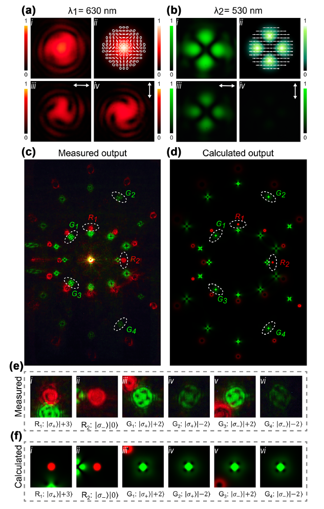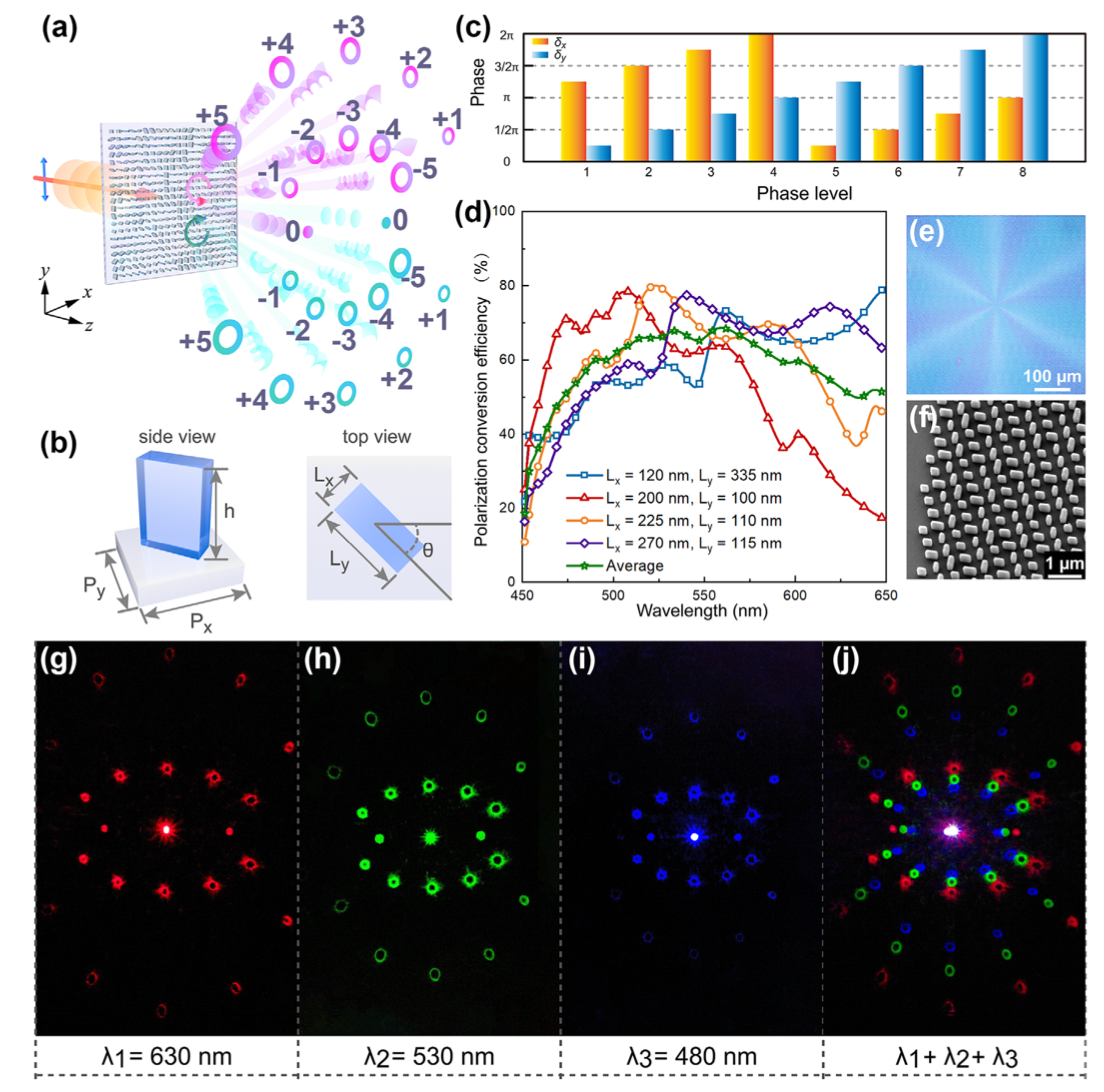 在以往的研究中,OAM检测的实现手段包括等离激元光学器件,变换光学系统和达曼涡旋光栅等。无疑这些方法给OAM的检测提供了新的思路,但同时也带来了其他限制。针对以上问题,该研究提出一种基于单层全介质超构表面的OAM解复用器件,可以用于光场信息的多维度检测,包括光的SAM信息,OAM信息和波长信息。超构表面的设计结合了两种类型的光学相位调制,包括几何相位和动态相位,可以解决SAM信息丢失的问题。而介质材料在可见光波段的低损耗特性可以进一步提高透射型器件的效率。当携带不同SAM和OAM模式的共轴光束经过该解复用器件后,被衍射为一系列沿不同波矢方向传输的涡旋光束。入射光的本征SAM和OAM信息被转化为光场强度的空间分布信息,可以通过成像系统进行采集和分析。此外,由于超构表面的宽带响应特性和动量守恒原则,该器件可以进一步对波长信息进行解复用。通过该器件可以将带有不同SAM,OAM和波长信息的复杂叠加场解复用,并将三个信息维度作为独立信道处理。因此该器件有望在集成化的微纳光学系统和量子通信系统中发掘应用。该器件能够直观建立起光场多维信息与光场分布图样的联系,对于提高系统的信息容量有着重要意义。而由于超构表面的平面结构和超薄化等特点,该解复用器在集成光通信系统和量子信息系统中有着广阔的应用前景。