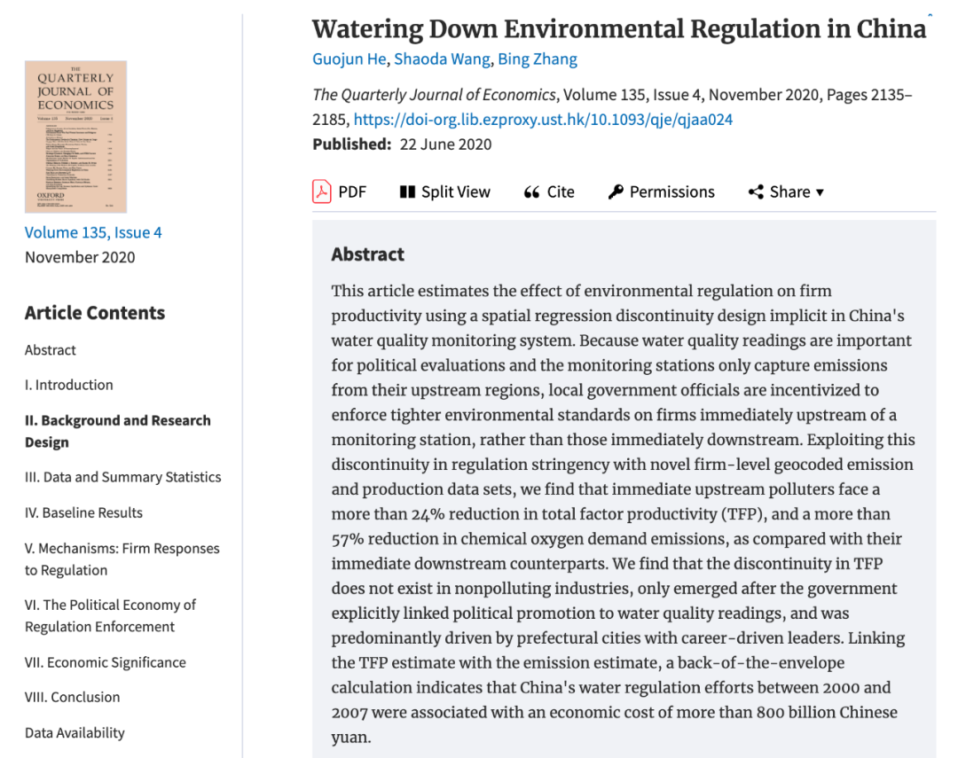 近日,由凯发k8官网环境管理与政策研究中心张炳教授和何国俊(香港科技大学)、王绍达(芝加哥大学)合作完成的研究"Watering Down Environmental Protection in China(顺流而下的环境保护)"被经济学顶级期刊The Quarterly Journal of Economics(QJE)接受发表。该研究利用地表水水质监测站点带来的空间断点,估计了环境监管对企业生产率的影响。利用2000年到2007年期间中国工业企业和重点排污染企业的地理、生产、经营、排放等信息,分析了紧挨着监测站的上下游企业之间污染物排放和全要素生产率(TFP)区别。研究发现,位于监测站上游的污染企业显著减少了各类水污染物排放水平,但会导致更低的全要素生产率。论文为了解环境保护政策的成本和收益以及最优政策设计至关重要。